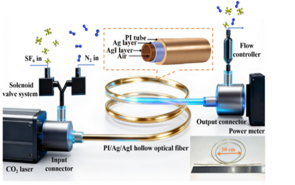 该项目历时两年,创新性地采用自研聚酰亚胺(polyimide,PI)空芯光纤作为气室与光传输通道,结合CO₂激光光源与信号探测系统,成功构建出一种超快高灵敏度的六氟化硫(Sulfur hexafluoride,SF₆)气体传感器研究方案。项目由敬承斌教授、褚君浩院士、刘侃老师共同指导,祝润苗同学任负责人,陈翘楚、张至立、徐凤乾、谢海洋、但林虹、夏天睿、彭思祺等同学共同完成。