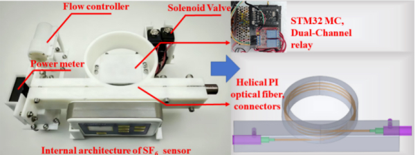 SF₆因其特殊化学性质及优异电气绝缘与高压灭弧性能,在电力、半导体芯片刻蚀、化学冶金与医学诊断等行业领域发挥关键作用。目前SF₆传感器在兼顾超快响应/恢复、高灵敏和低成本等方面还存在极大挑战。为此,本项目提出超快高灵敏度PI空芯光纤SF₆气体传感器的研究方案。方案以自制PI/Ag/AgI空芯光纤作为气室和光传输通道,利用CO₂激光作光源,功率探测器采集信号构建传感器。基于射线模型设计传感器用光纤,采用等离子体处理技术和动态液相沉积法制备柔性、低损耗、高传输可靠性的适用于传感检测的PI/Ag/AgI空芯光纤。基于浓度分析新模型设计嵌入式软件构建螺旋集成型小型化样机。该样机灵敏度达0.39dB/ppm,检测极限低至62.5ppb,响应速度≤3s,且体积小、自动化程度高,有望为工业生产安全和环境保护保驾护航。