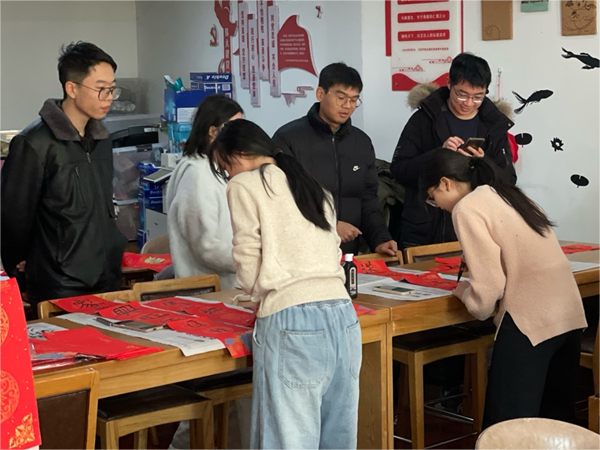 在“翰墨写春”区域,同学们将对新年的期许融入笔端。有的同学书写下气势饱满的“福”字,祝愿学研并进;有的则创作出意蕴吉祥的联句,字里行间跳动着“科研顺利、成果丰硕”的真挚愿望。红纸黑字间暖意涌动,喝彩声此起彼伏,大家在墨香中共同祈愿来年万事顺遂。